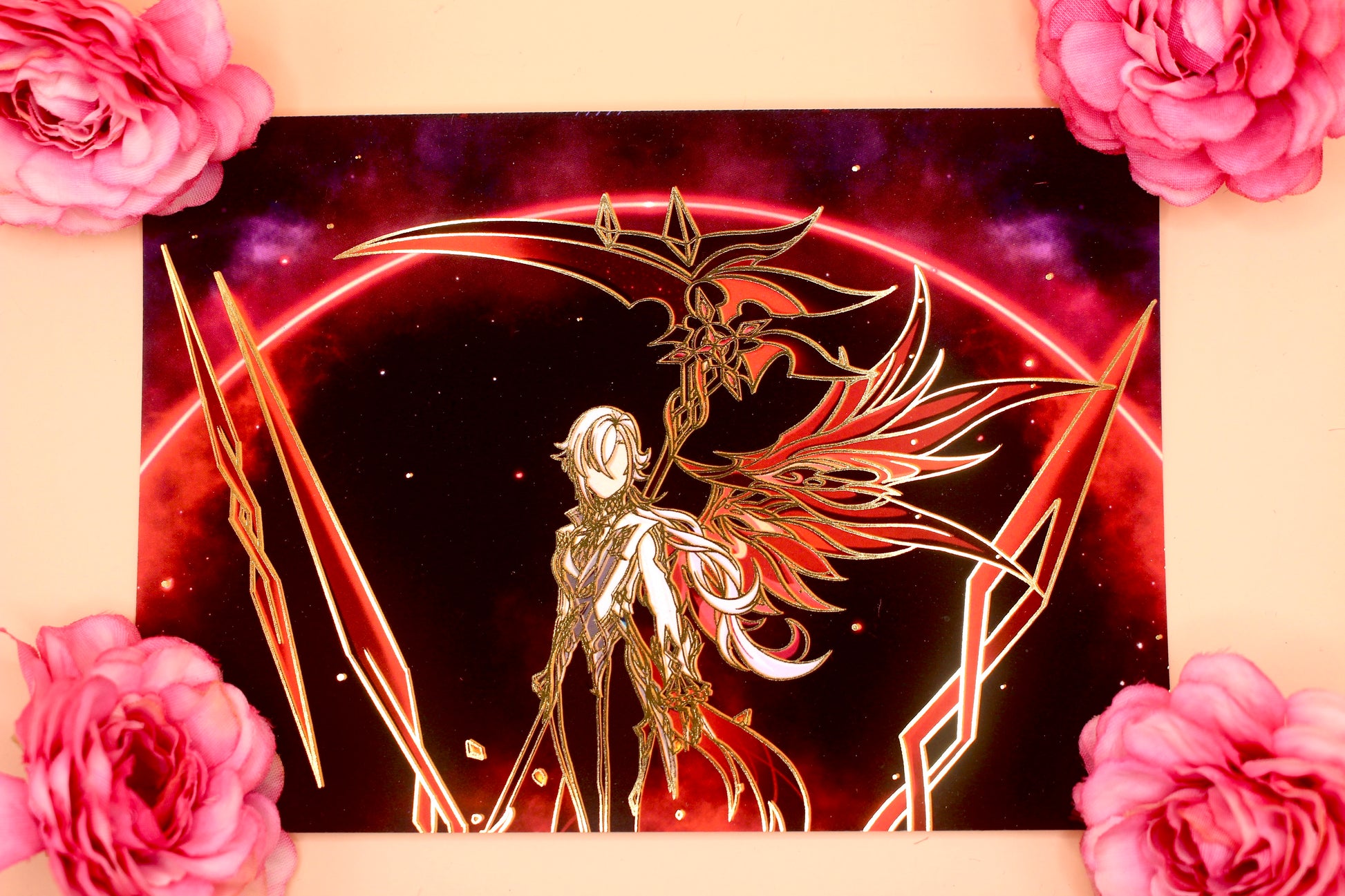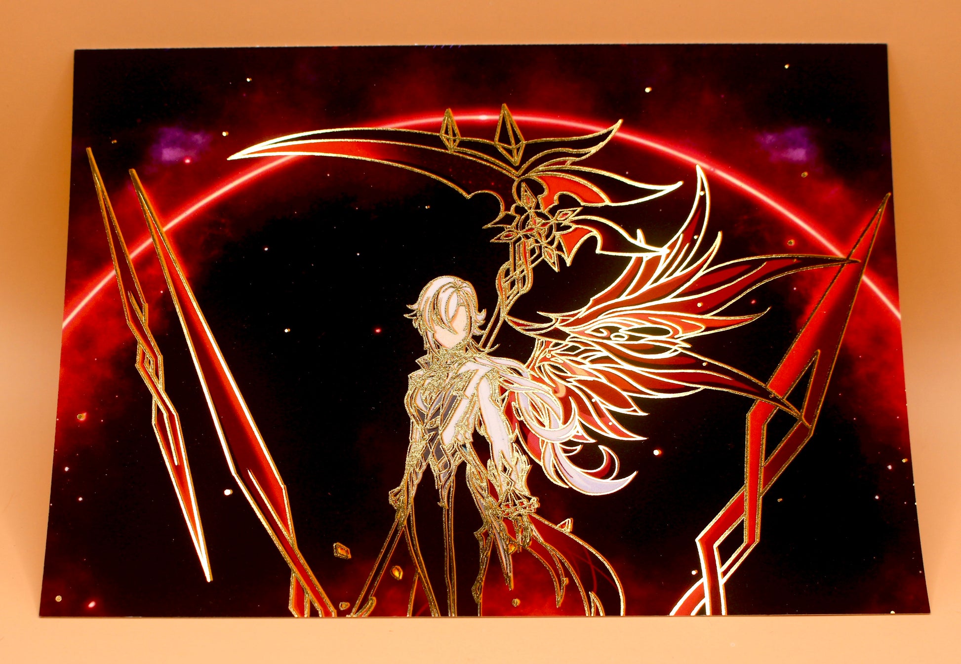 Gold Foil Postcard of Arlecchino from Genshin Impact.