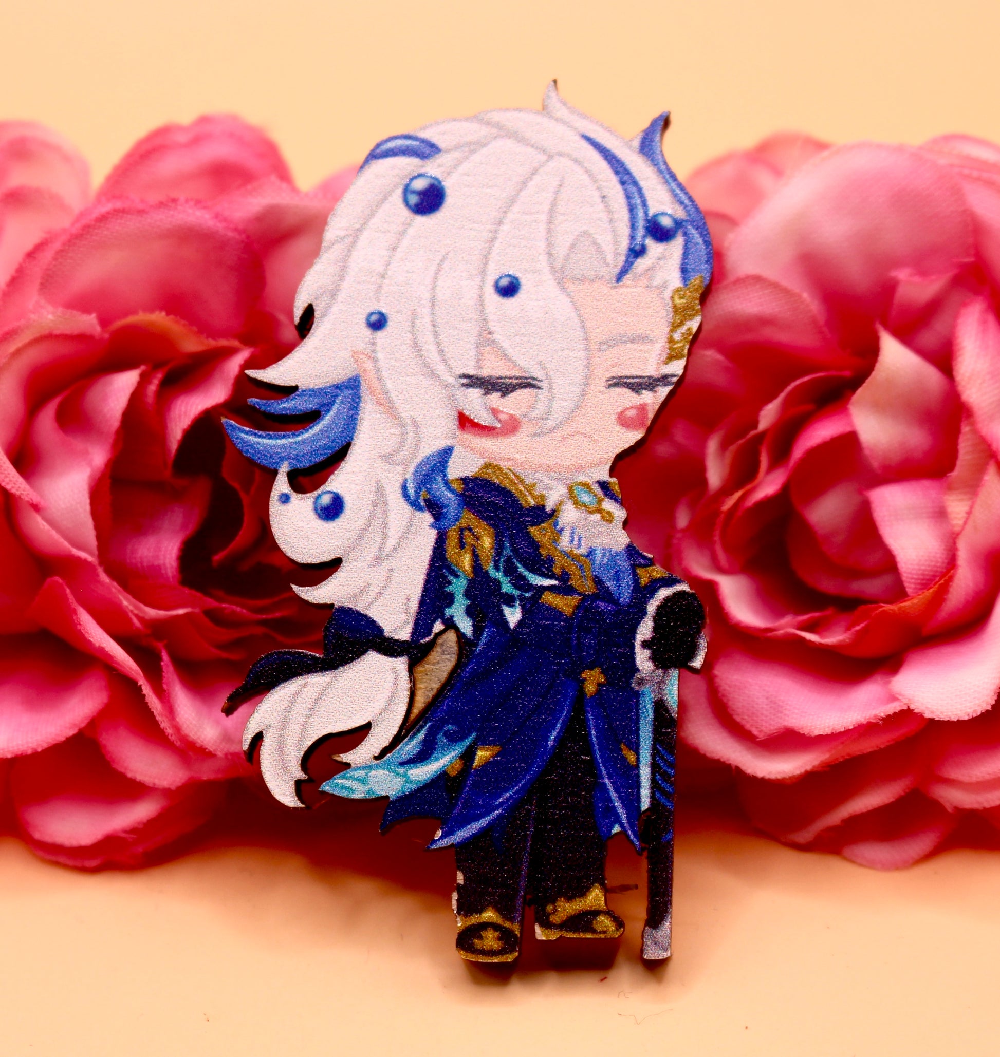 Wooden Pin with spot Gloss of Neuvillette from Genshin Impact.